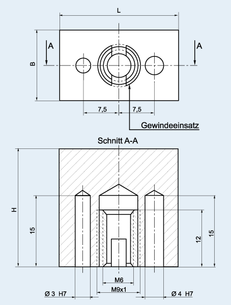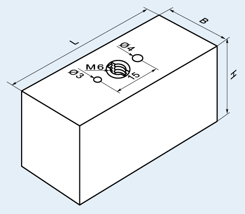LxB=40x25, H= 40 mm; mit M6 Gew.-Einsatz 1xGew.M6/2Bohrungen(3+4mm H7) |